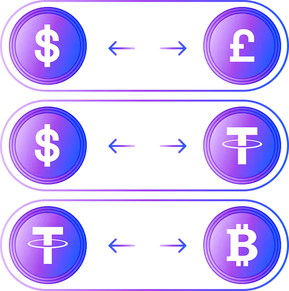We provide access to a wide range of fiat and crypto pairs, including USD, EUR, GBP, AED against BTC, ETH, USDT, USDC, and other major digital assets. Custom pairs can also be supported depending on liquidity and demand.